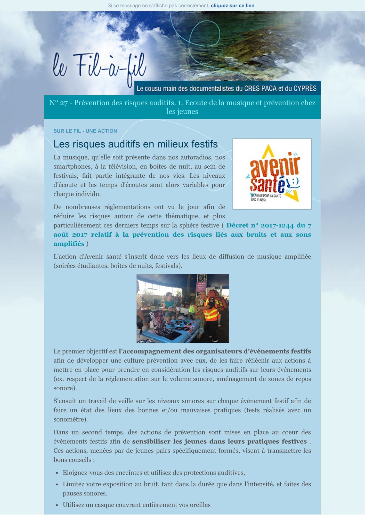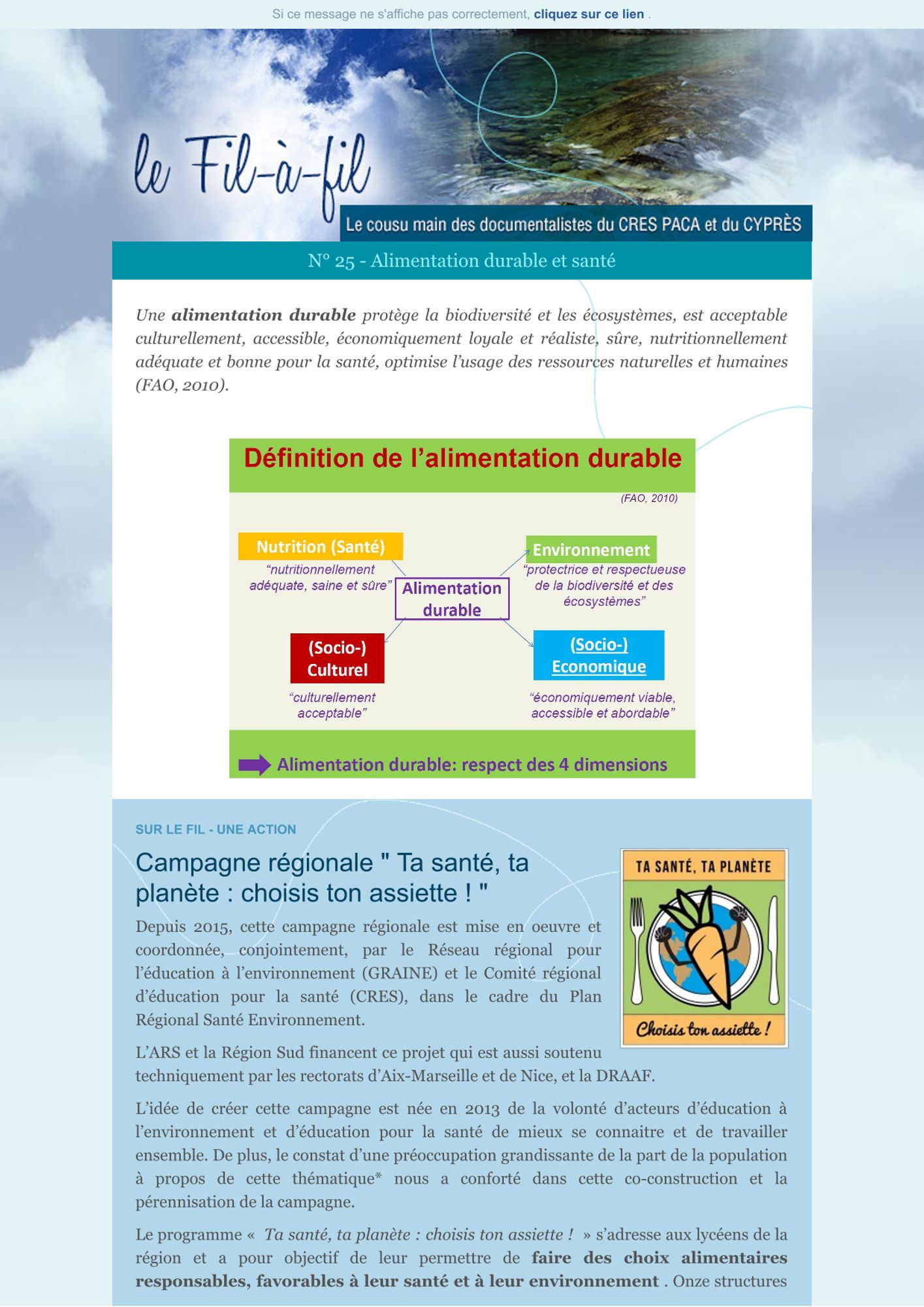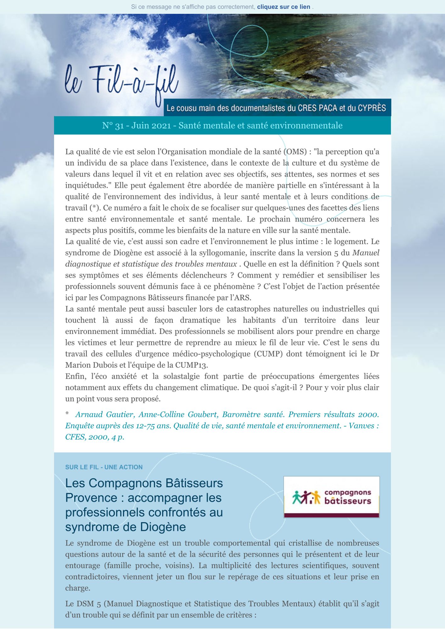 Inscrivez-vous au Fil-à-Fil, la Lettre électronique réalisée par les documentalistes du CRES PACA et du CYPRES destinée aux acteurs de la santé environnementale.