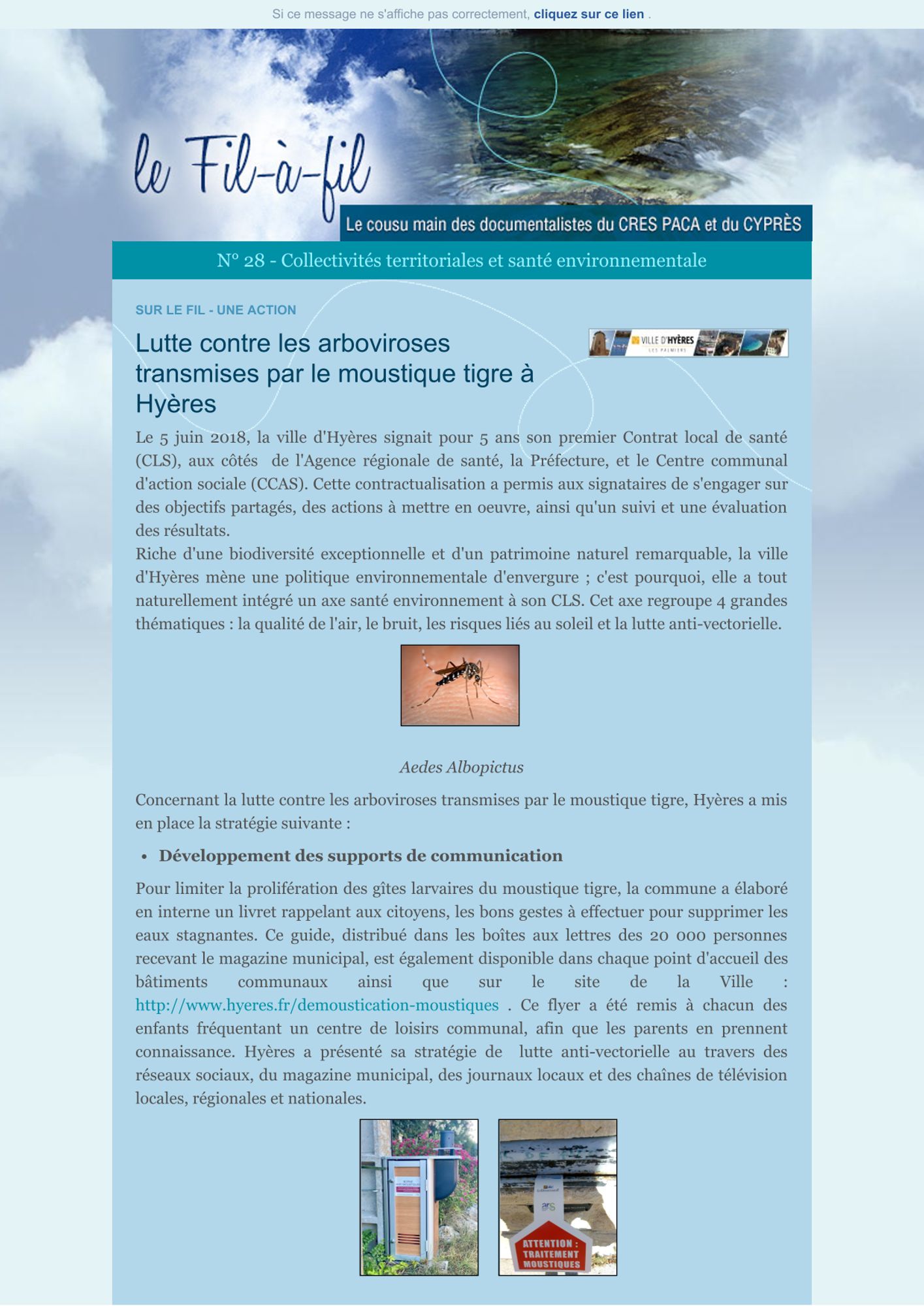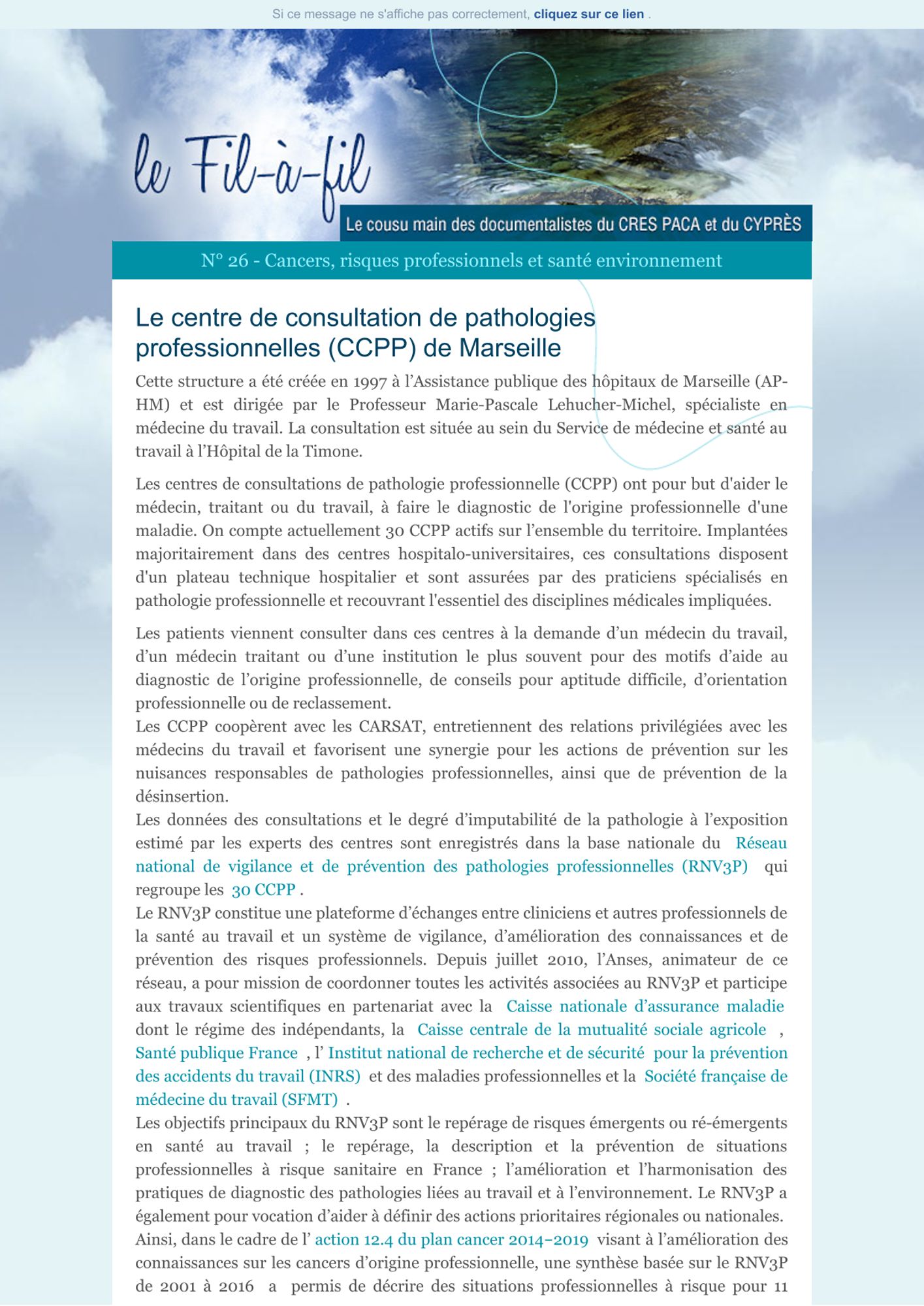 Quatre fois par an, sur un thème spécifique de la santé environnementale, les documentalistes vous proposent dans le Fil-à-Fil un coup de projecteur sur un acteur et une action de la région Provence-Alpes-Côte d'Azur et une sélection de ressources.