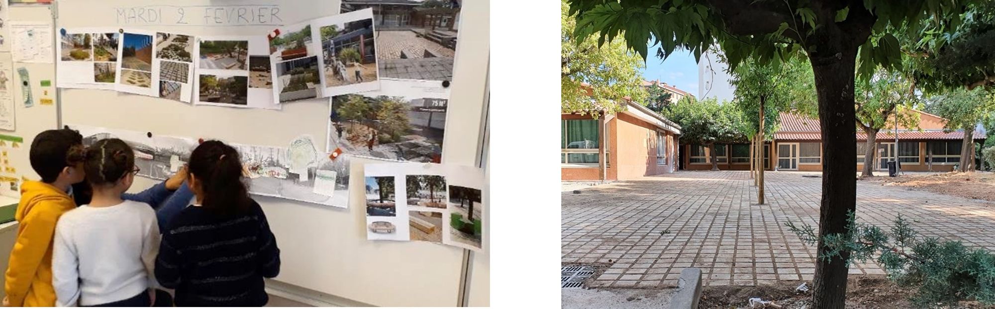 Le CPIE s’est chargé d’animer l’opération auprès des écoles dans une optique de co-construction et de sensibilisation à différentes thématiques : gestion de l’eau, îlots de chaleur et de fraicheur, biodiversité, santé et cadre de vie. Un diagnostic des usages a été réalisé par le CPIE auprès des élèves, des équipes pédagogiques et périscolaires, des personnels d’entretien et des services de la Ville, par l’intermédiaire d’entretiens ou d’ateliers afin de recenser les usages et besoins de chacun. Puis, une seconde phase de co-construction des aménagements a été menée auprès des élèves et enseignants dans le but de récolter leurs souhaits d’aménagements, qui ont été ensuite transmis à la Ville. Enfin, de nouveaux ateliers de sensibilisation ont eu lieu avec les classes participantes au printemps 2021 pour présenter les projets retenus par la Ville sur les deux groupes scolaires. La question de la lutte contre les îlots de chaleur a également été abordée lors de ces ateliers. Les travaux d’aménagements des cours ont été réalisés principalement durant l’été 2021. A la rentrée, des ateliers « post-travaux » ont été menés, avec définition des règles d’usage des nouveaux espaces et observations de la faune et la flore. Ces ateliers ont pu être co-financé grâce à une subvention de l’ARS PACA. Au total, 16 classes soit environ 320 élèves, ont pris part aux projets de désimperméabilisation. Les travaux se sont achevés pendant les vacances de la Toussaint avec la plantation d’arbres et l’ensemencement des bancs jardinières.