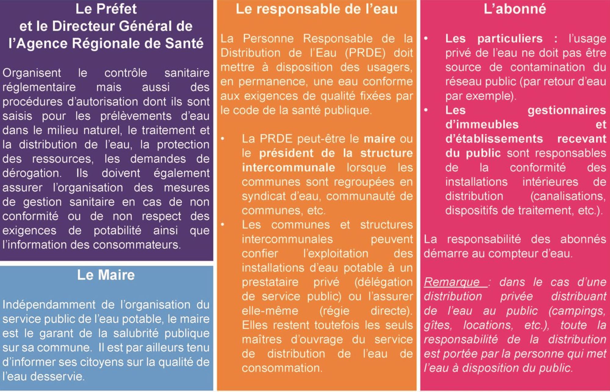 Les acteurs qui interviennent dans le circuit de distribution de l'eau destinée à la consommation humaine sont nombreux. Chaque acteur engage sa propre responsabilité dans l’exercice des compétences qui lui sont personnelles, mais peut aussi être co-responsable d’actions avec d’autres acteurs.